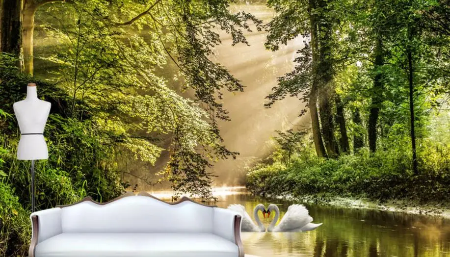 Customize Photo 3d Wallpaper Forest Swan Stream Living Room