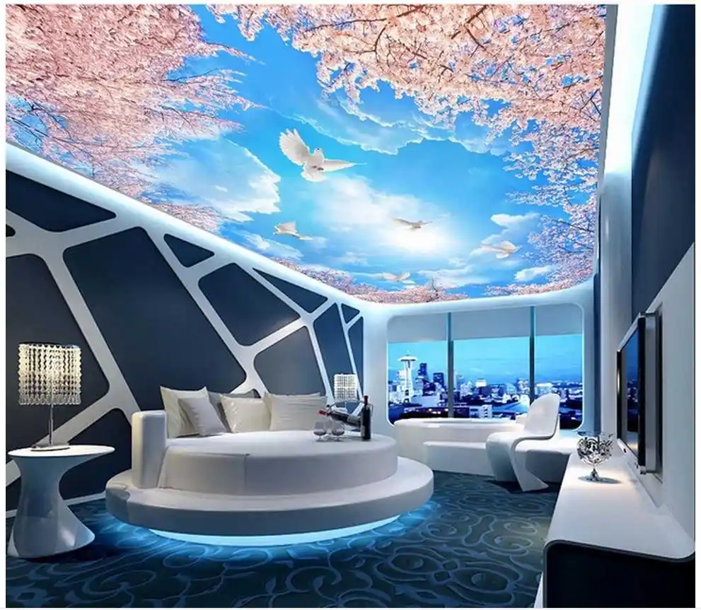 Custom 3d Ceiling Murals Cherry Blue Sky Pigeons Wallpaper For