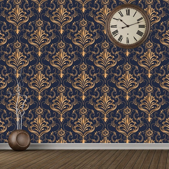 Damask Blue Wallpaper Dark Baroque Wallpaper Victorian Etsy