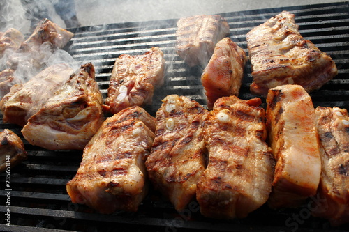 Pork Breast On Barbeque Ribs Roasted On A Bbq Grilled Meat On A