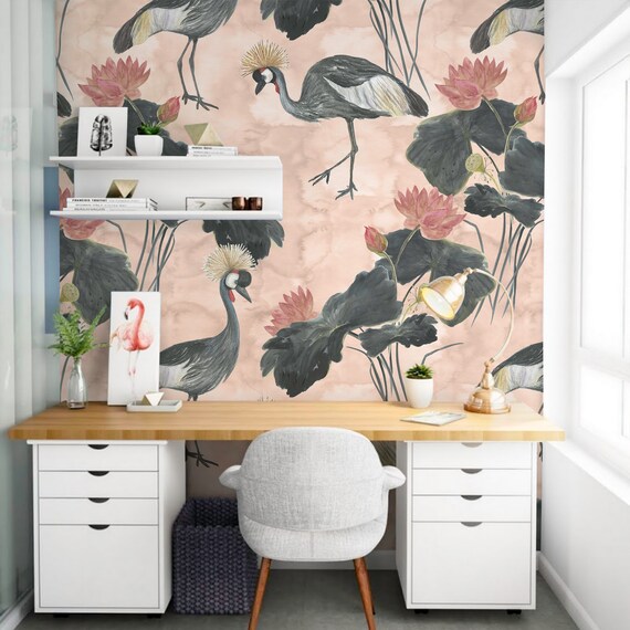 Cranes Birds Wall Mural Pink Flowers Peel Stick Wallpaper Etsy