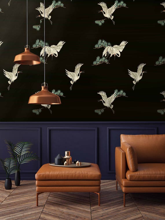 Japanese Print Chinoiserie Birds On Black Wallpaper Etsy
