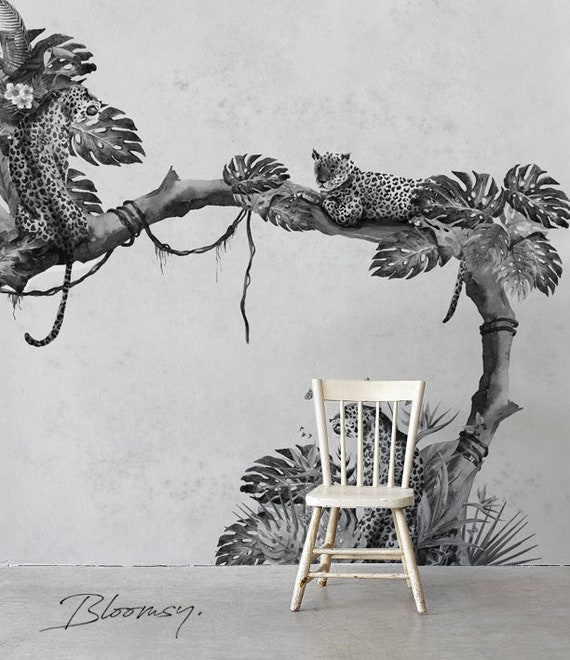 Removable Wallpaper Tropical Cheetahs Black And White Mural Etsy