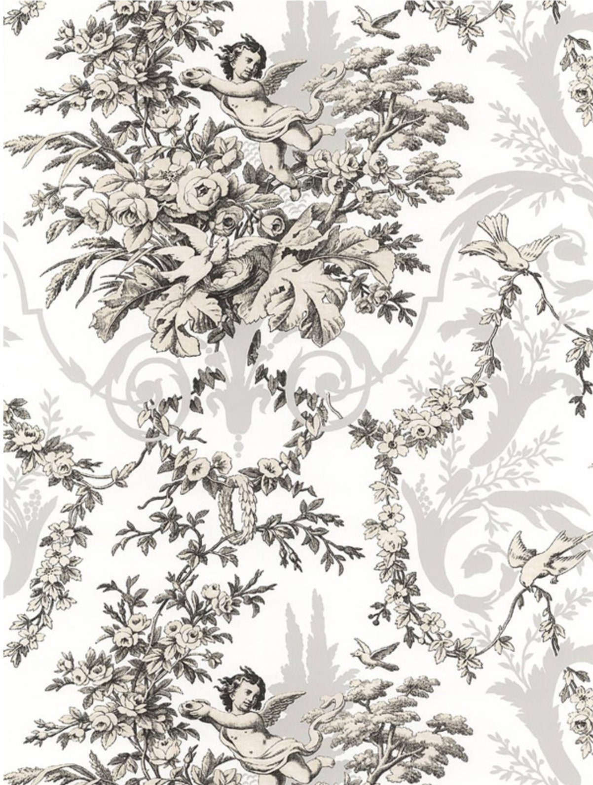 Black White Cherub Rose Floral Toile Wallpaper Vintage Etsy