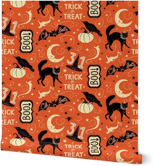 Retro Halloween Wallpaper Roll Vintage Trick Or Treat Boo Kitsch Crow Black Cat Pumpkin Bat Orange Johanna Parker By Johannaparkerdesign 1 Roll 24in X 27ft Amazon Com