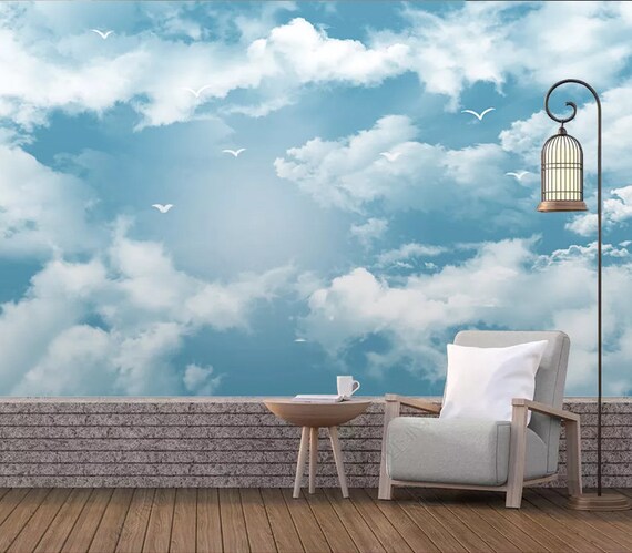 Hand Painted Blue Sky Clouds Wallpaper Wall Mural Beautiful Etsy