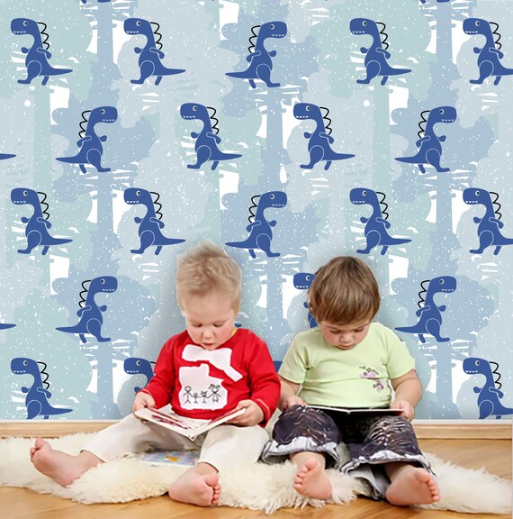 3d Kids Cartoon Blue Dinosaur Wallpaper Nursery Wallpaper Etsy