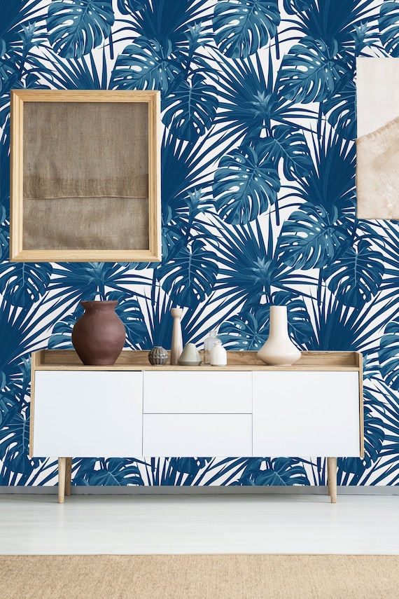 Blue Exotic Leaves Removable Wallpaper Peel And Stick Etsy