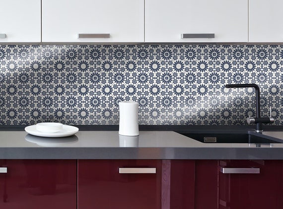 Dark Blue Tile Kitchen Decor Wallpaper Kitchen And Bathroom Etsy