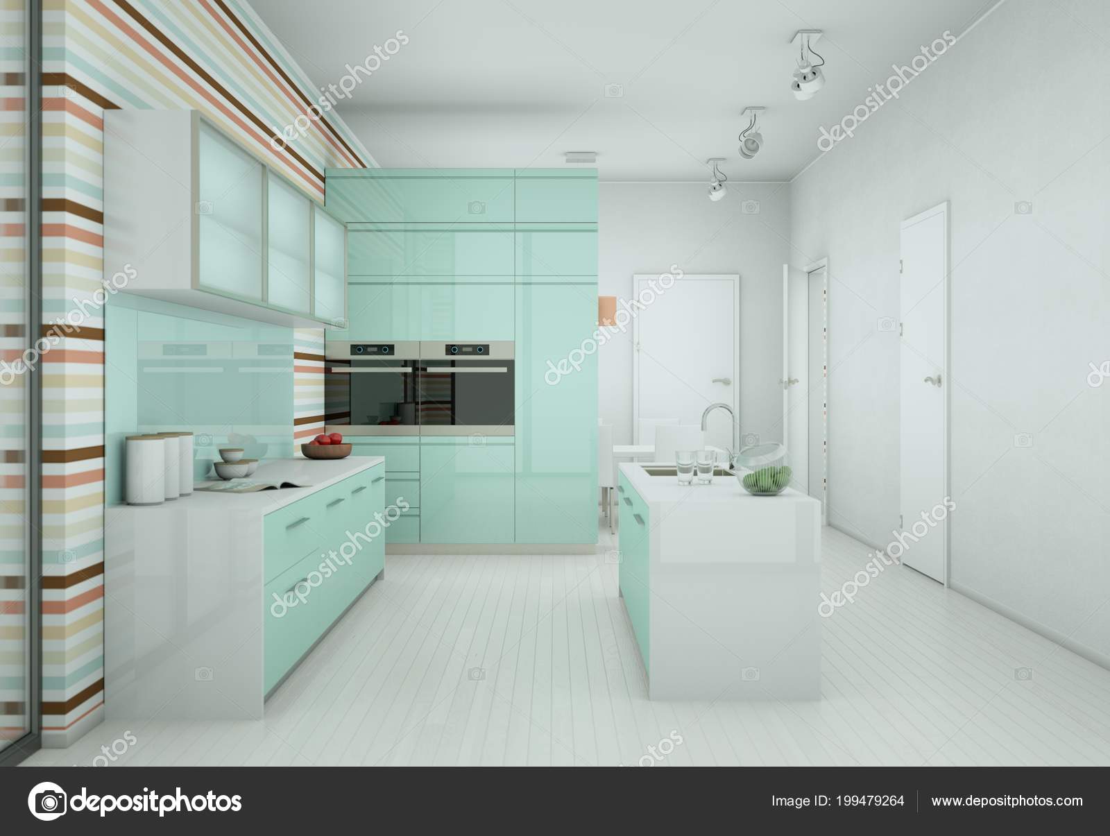 Light Blue Modern Kitchen With Vintage Wallpaper 3d Illustration