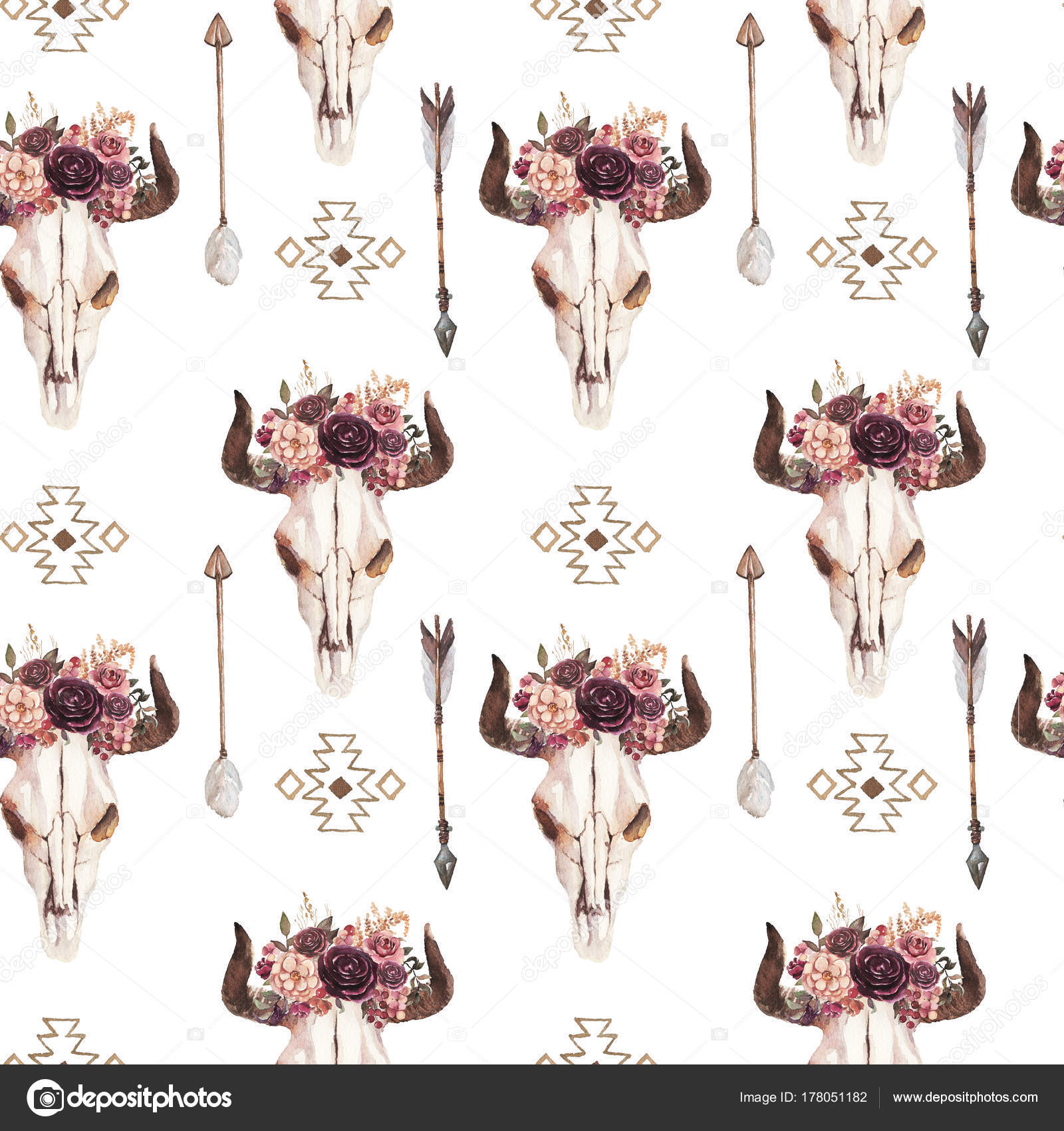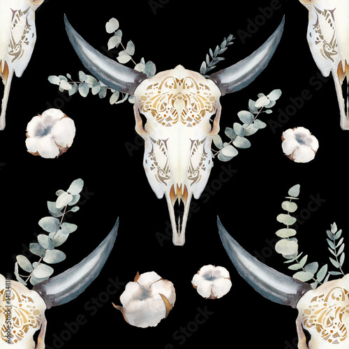 Watercolor Ethnic Boho Seamless Pattern Bull Cow Skull Horn Floral