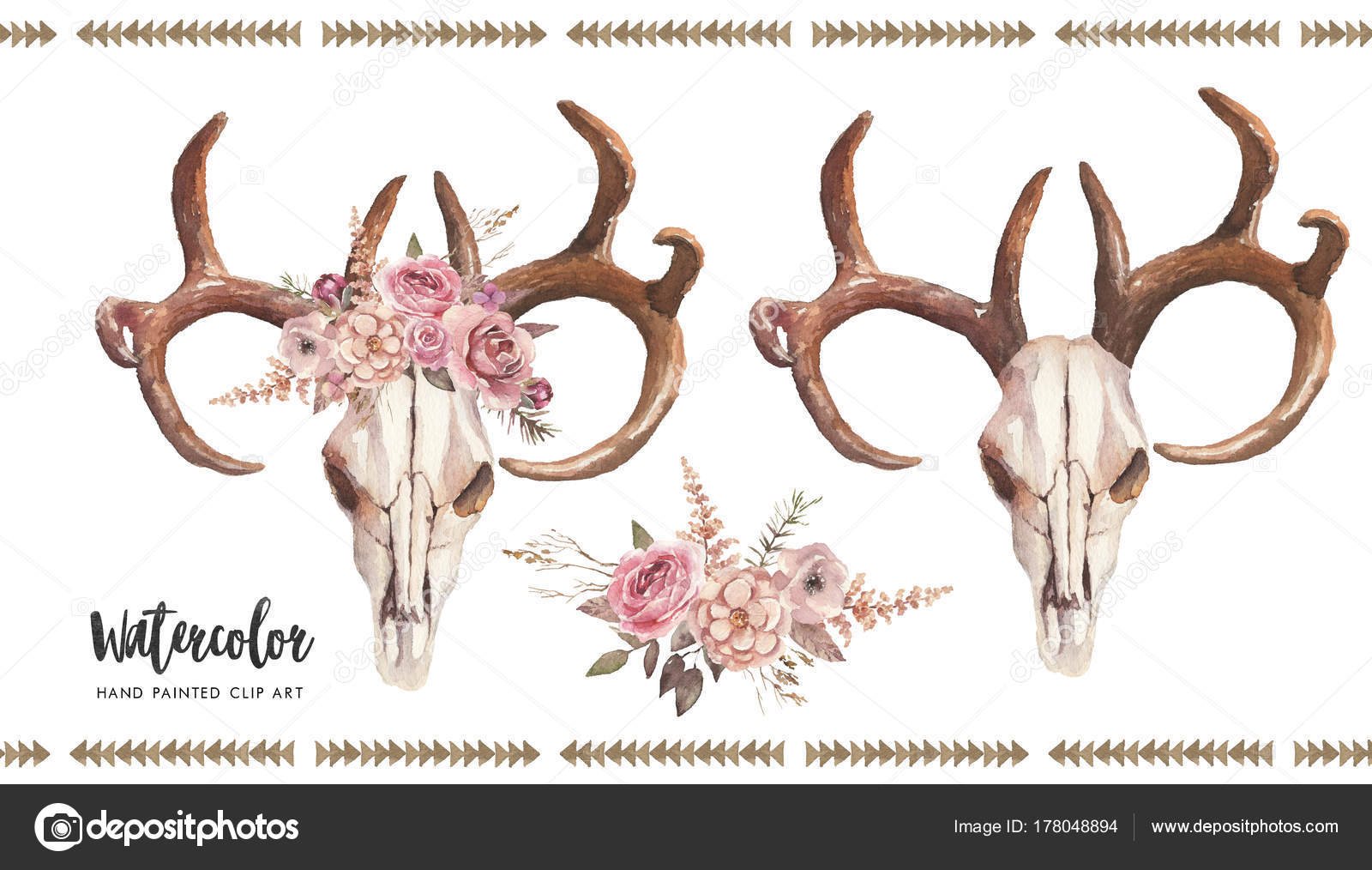 Watercolor Skull With Antlers In Flowers Hand Painted Etsy In