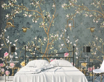 Chinoiserie Removable Wallpaper Floral Vintage Bird Wall Etsy