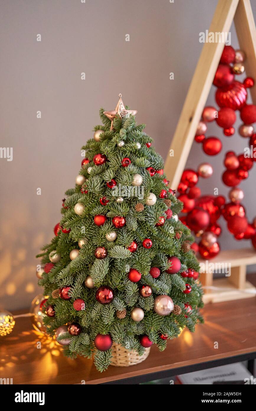 Beautiful Small Christmas Tree On Wooden Table Happy Mood