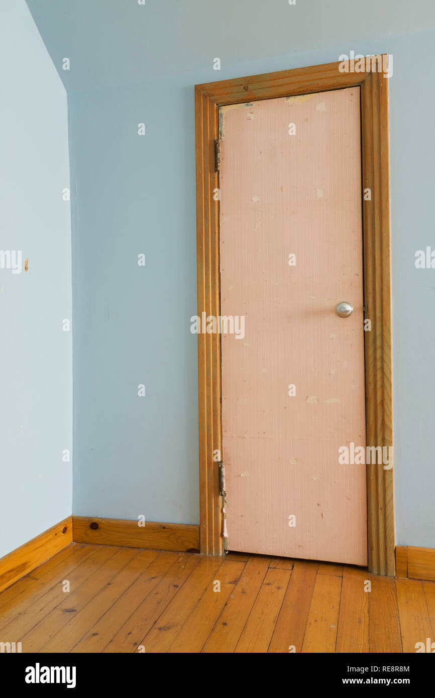 Old Wooden Closet Door Covered With Rose Coloured Wallpaper In