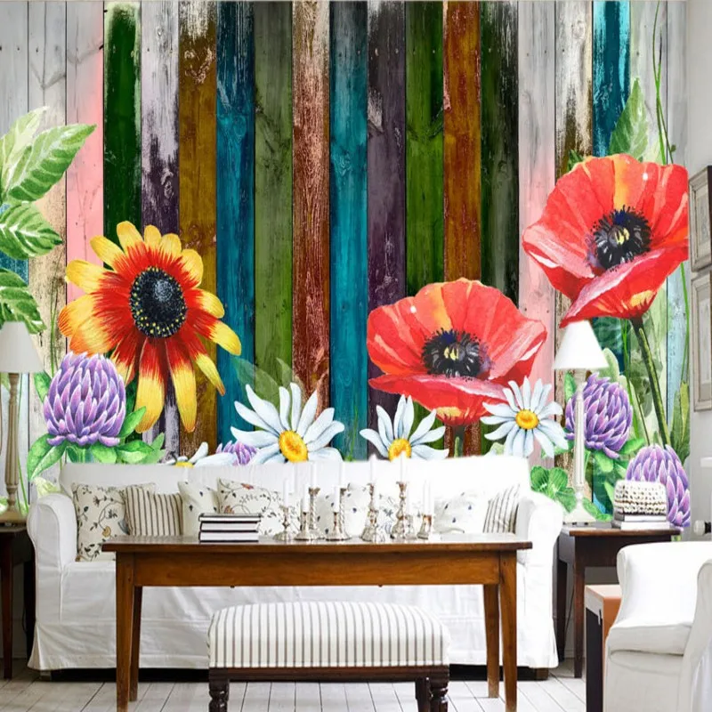Photo Wallpaper Colorful Floral Mural Custom Color Wooden Board