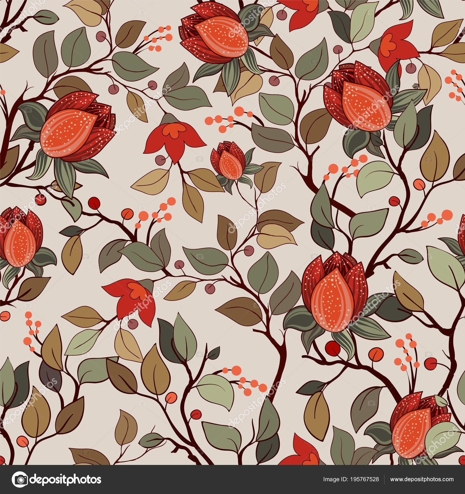 Colorful Floral Seamless Pattern With Berries Leaves And Flowers