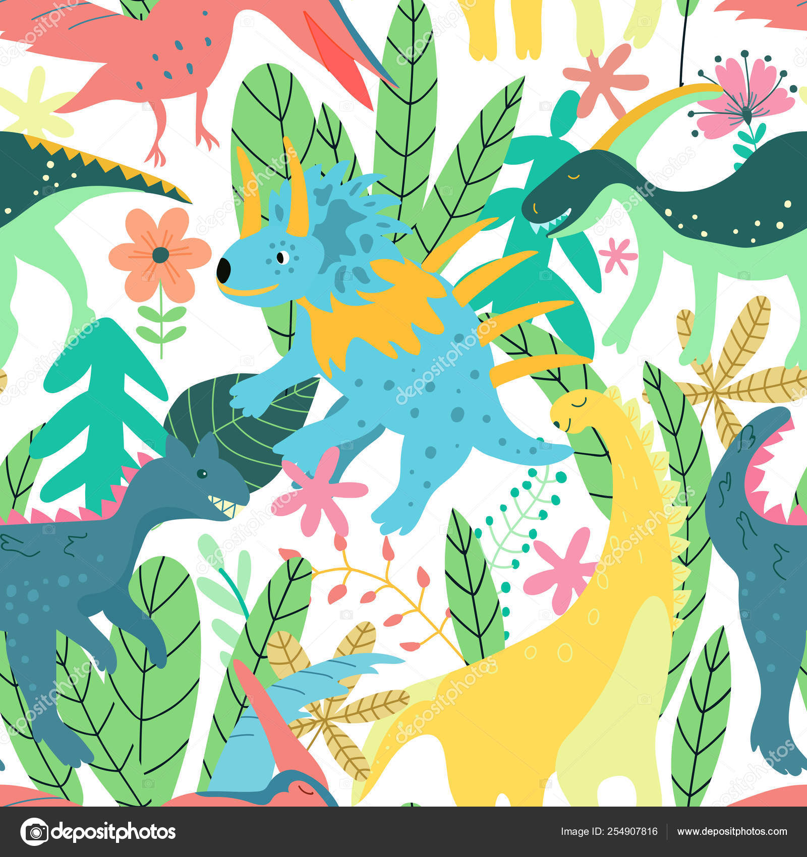 Colorful Dinosaurs Forest Seamless Pattern Jungle In Retro Style