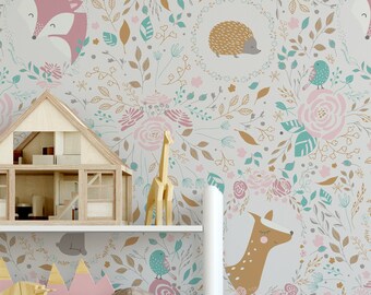 Woodland Floral Vintage Wallpaper Pink And Mint Colorful Etsy