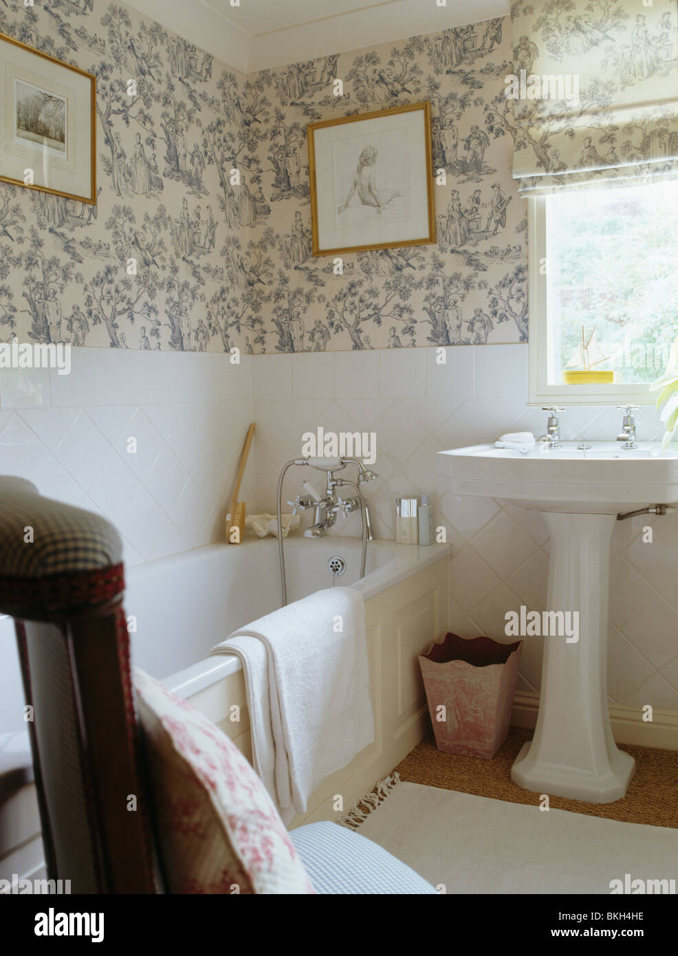 Blue White Wallpaper In Small Country Bathroom With White Pedestal