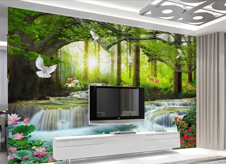 Custom 3d Wallpaper Roll 3d Green Big Tree Forest Waterfall Photo