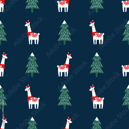 Christmas Tree And Cute Lama With Xmas Hat Seamless Pattern On