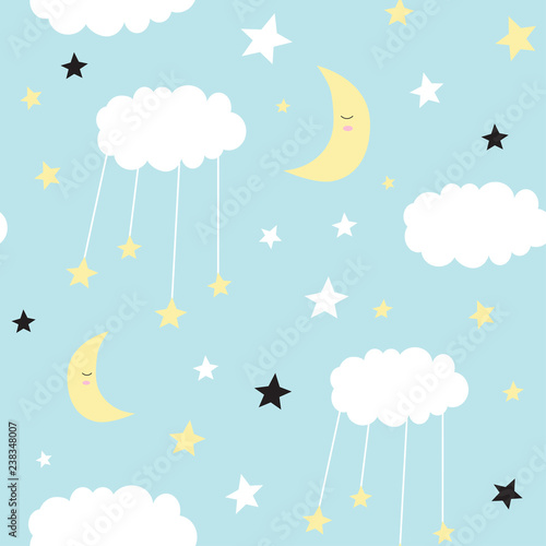 Cute Adorable Baby Cloud And Moon Stars Cartoon Seamless Pattern