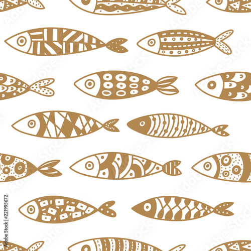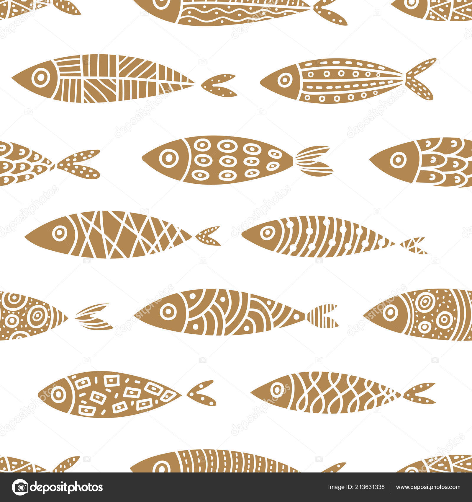 Line Seamless Pattern With Cute Gold Fish Sea Background