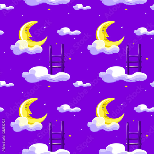 Cute Moon Stairs Clouds And Night Sky With Stars Seamless