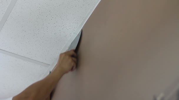 Worker Cuts Extra Wallpaper Near The Ceiling Stock Video