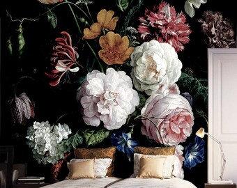 Still Life Floral Mural Dark Floral Mural Floral Wallpaper Etsy
