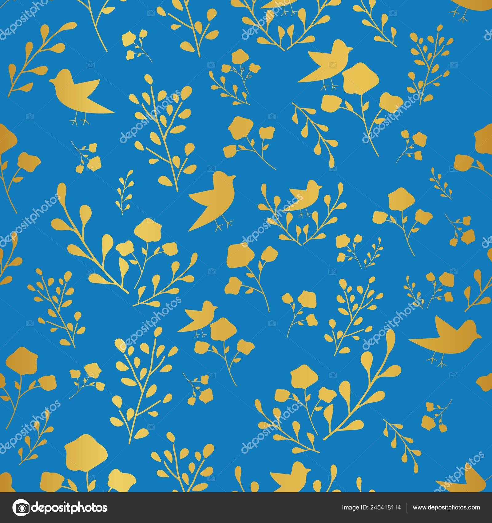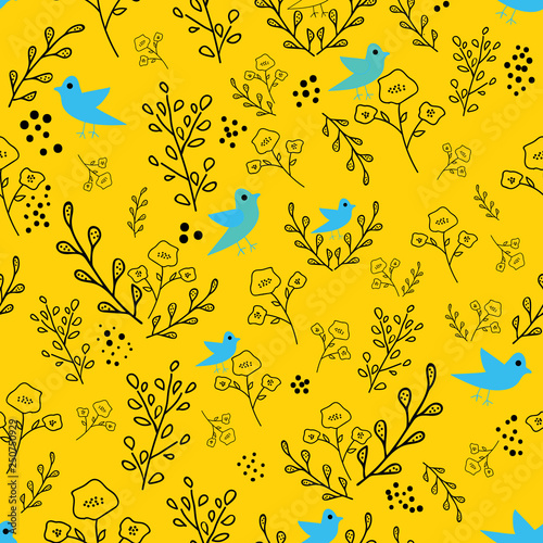 Black And Blue Hand Drawn Flowers And Birds On Yellow Background Seamless Pattern Whimsical Design Great For