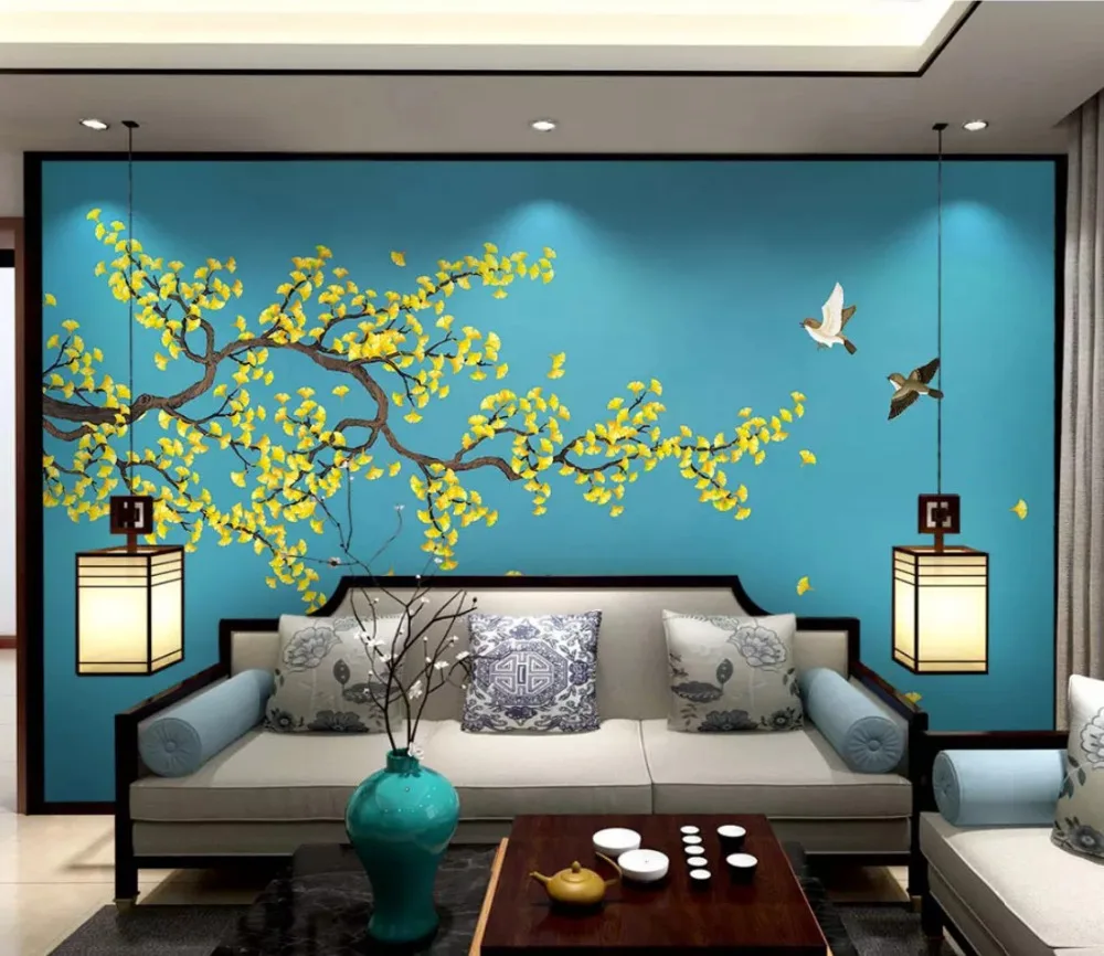 Customized Eco Friendly Wallpaper Ginkgo Hand Painted Flowers And