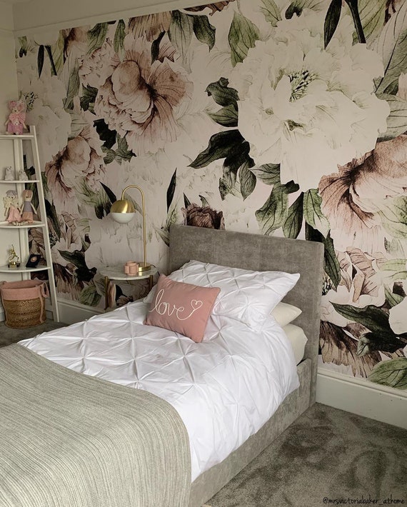 Blush Floral Wallpaper Mural Etsy Vintage Floral Wallpapers