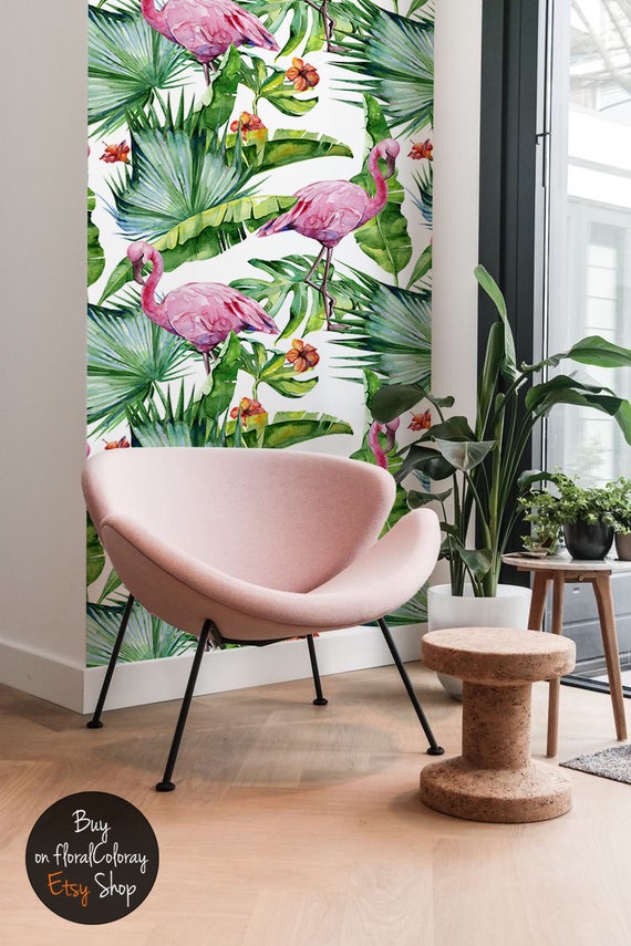 Monstera Flamingo Wallpaper Flowers Wall Mural Etsy