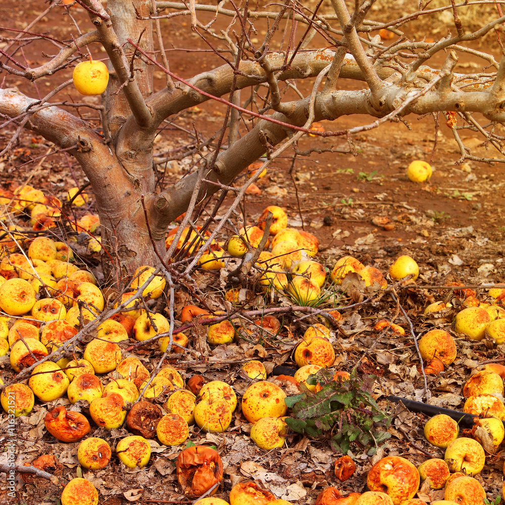 Fall Orchard Last Not Picked Yellow Apples On The Ground Naked Bare Apple Tree After The First Frost Nature Agriculture And Harvesting Theme Wall Mural Alexey Protasov
