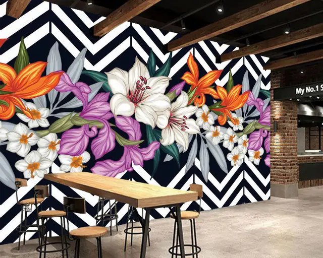 Custom Floral Wallpaper Black And White Stripes Flower Mural For