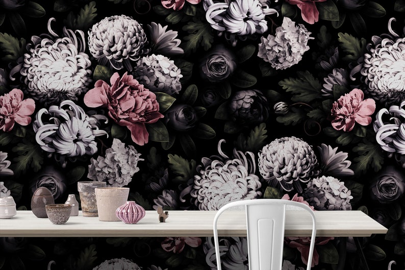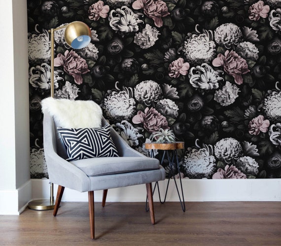 Black Background Floral Wallpaper Vintage Flowers Wall Paper Etsy