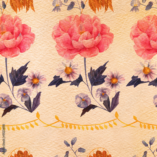 Vintage Seamless Wallpaper With Watercolor Flower Drawings On Old