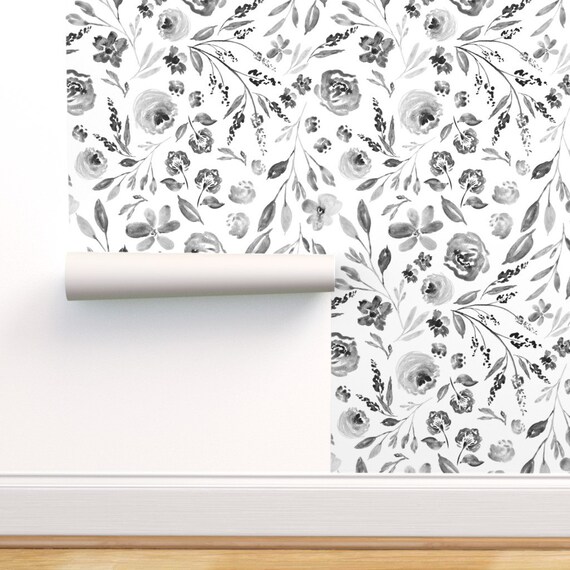 Monochromatic Watercolor Floral Wallpaper Contemporary