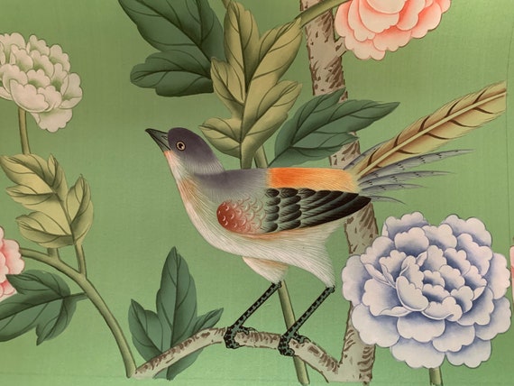 Hand Painted Emerald Green Backgroud Chinoiserie Wallpaper Etsy