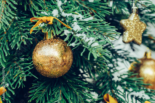 Green Fir Tree With Golden Balls Christmas Wallpaper Buy This