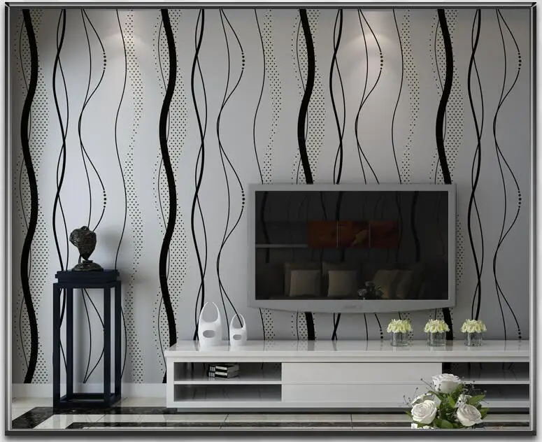 Modern Black And White Grey Vertical Stripes Wallpaper Tv Room