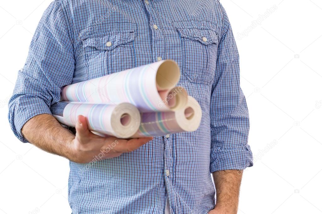 Handyman Carrying Rolls Of Wallpaper Stock Photo