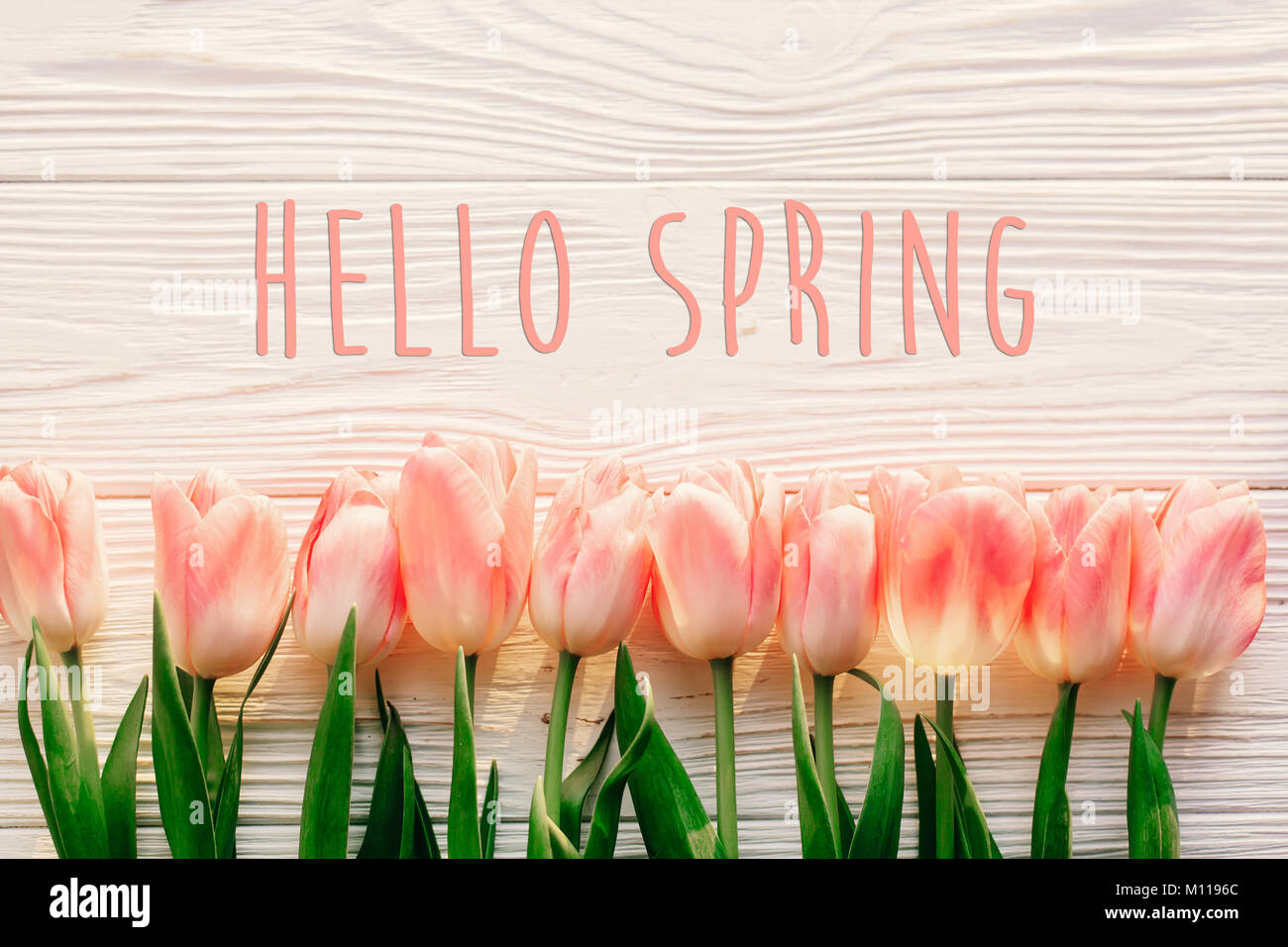 Hello Spring Text Sign Beautiful Pink Tulips On White Rustic Wooden Stock Photo Alamy