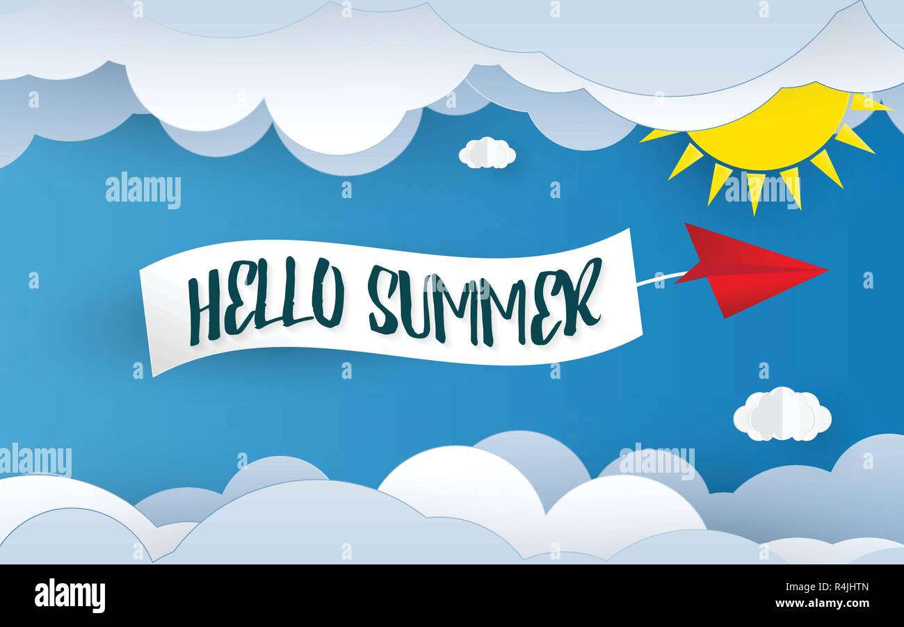 Hello Summer Paper Art Background Blue Sky And Cloud Element
