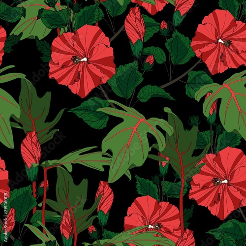 Red Hibiscus Flowers Monstera Leaves Tropical Seamless Pattern