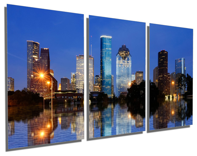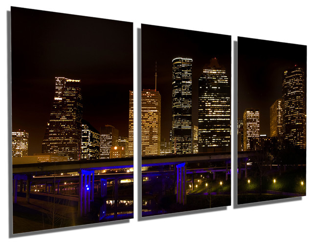 Houston Texas Night Skyline Metal Print Wall Art 3 Panel Split