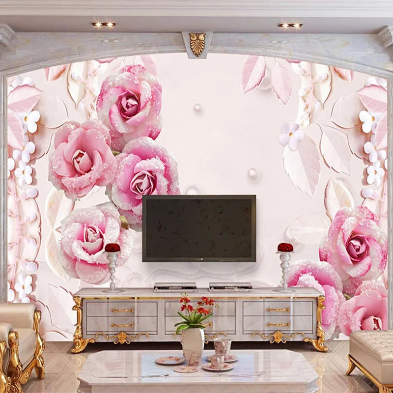 Custom Wallpaper 3d Stereo Romantic Pink Rose Pearl Jewel
