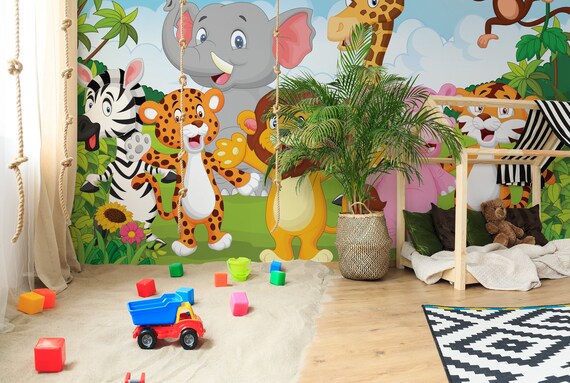 Jungle Animals Wallpaper Self Adhesive Wallpaper Cartoon Etsy